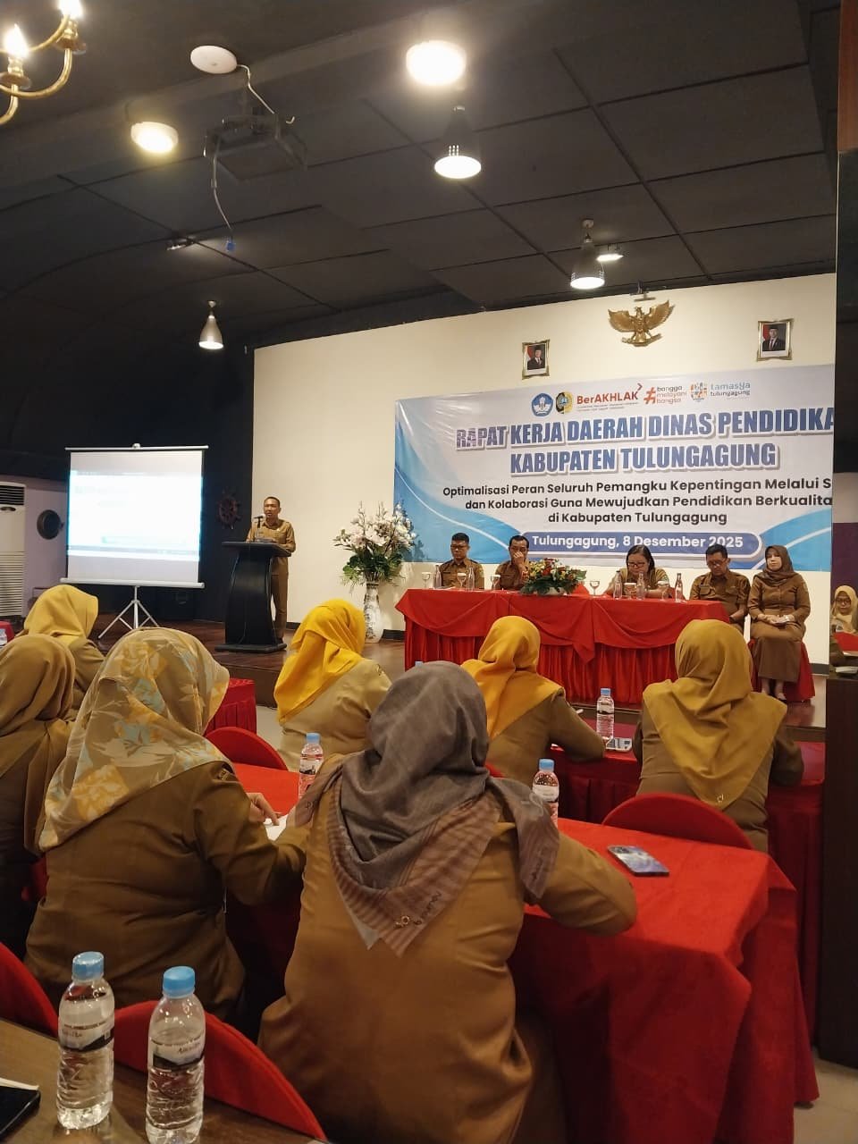 Tulungagung.OposisiNews.Net – Dinas Pendidikan Kabupaten Tulungagung hari Senin ( 8/12/25 ) resmi melaksanakan Rapat Kerja Daerah (RAKERDA) sebagai langkah strategis untuk menyusun program peningkatan mutu pendidikan di tahun 2025. Acara tersebut berlangsung di Hall Barata dan dihadiri 93 peserta terdiri dari para kepala sekolah,Paud,TK,sekolah dasar hingga menengah pertama juga hadir dari kepala UPT TB 2KS, petugas BOSP serta beberapa kepala bidang di dinas pendidikan kabupaten Tulungagung.